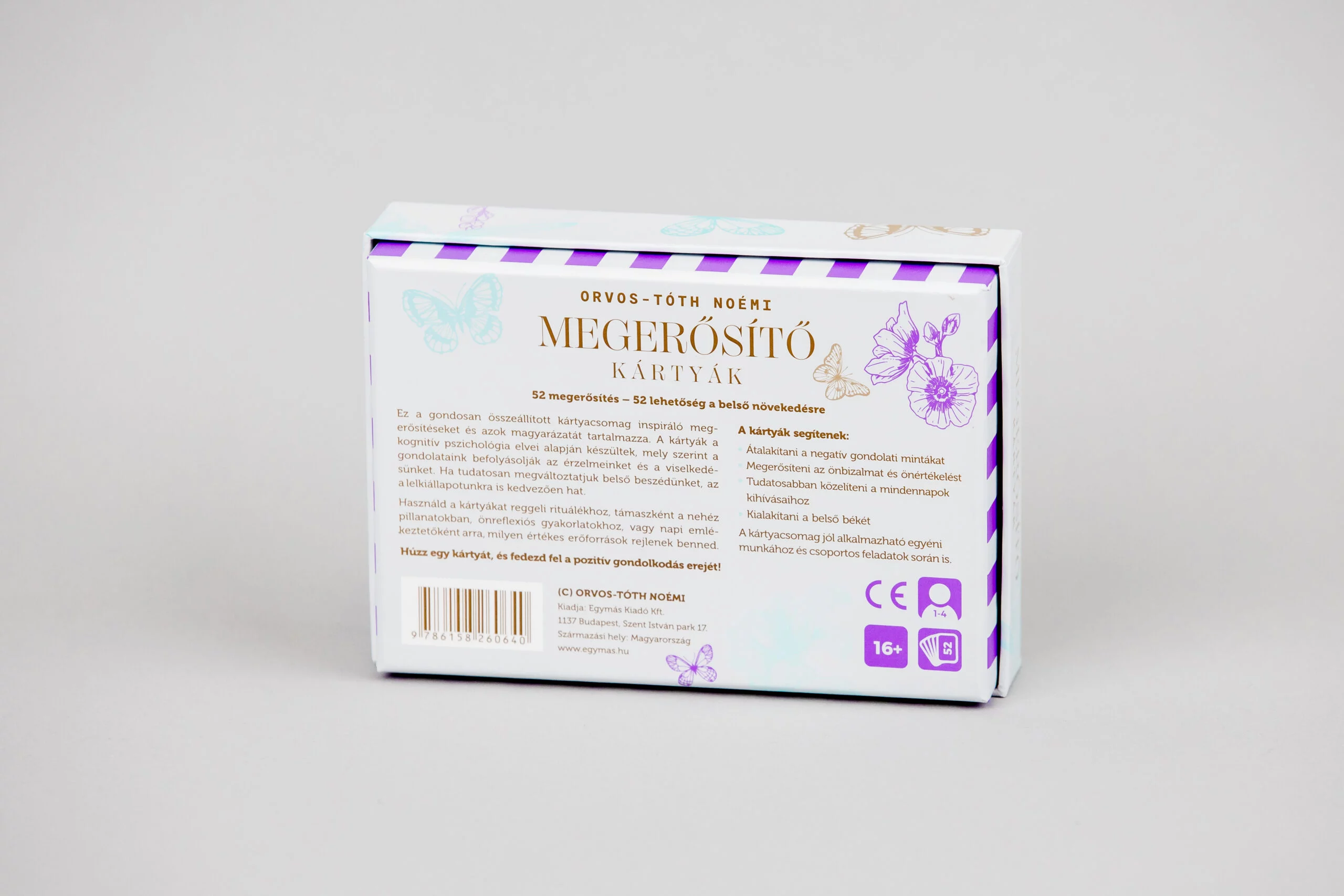 Húzz egy kártyát, és fedezd fel a pozitív gondolkodás erejét! Ez a gondosan összeállított csomag inspiráló megerősítéseket és azok magyarázatát tartalmazza. A kártyák a kognitív pszichológia elvei alapján készültek, mely szerint a gondolataink befolyásolják az érzelmeinket és viselkedésünket. Ha tudatosan megváltoztatjuk belső beszédünket, az a lelkiállapotunkra is kedvezően hat. Használd a kártyákat reggeli rituálékhoz, támaszként a nehéz pillanatokban, önreflexiós gyakorlatokhoz, vagy napi emlékeztetőként arra, milyen értékes erőforrások rejlenek benned.